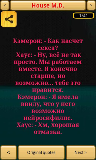 В данный момент доступная версия приложения 1.1.2, которая включает в себя 5 сериалов и дает возможность читать цитаты как на русском так и на английском языках! Также добавлена поддержка английского интерфейса для инстранных пользователей.